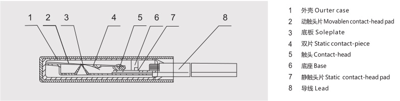 件處于自由狀態(tài),動觸頭與靜觸片閉合,電路導(dǎo)通。當(dāng)使用電器因故發(fā)熱,溫度上升到該產(chǎn)品額定動作溫度值時,雙金 屬 元 件